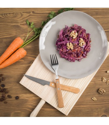 Ingredientes: Col morada 48%, manzana 14%, zanahoria, aceite de oliva virgen extra, NUECES 5%, vinagre de Montilla-Moriles (SULFITOS), pasas 3% (uva pasa y aceite de girasol), sal, ajo y pimentón dulce.