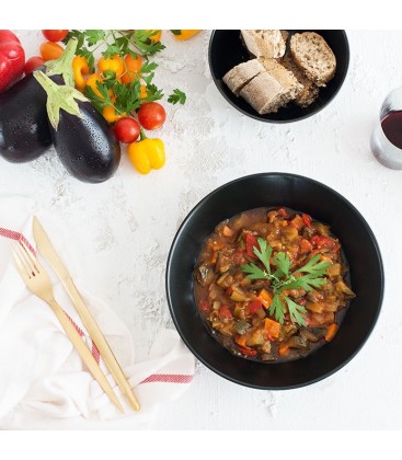 Ingredientes: berenjena 23%, calabacín 23%, pimiento rojo 11%, pimiento verde 11%, tomate frito 16% (tomate, cebolla, pimiento rojo, zanahoria, aceite de oliva virgen extra, azúcar, sal, ajo), cebolla 11%, aceite de oliva virgen extra y sal.